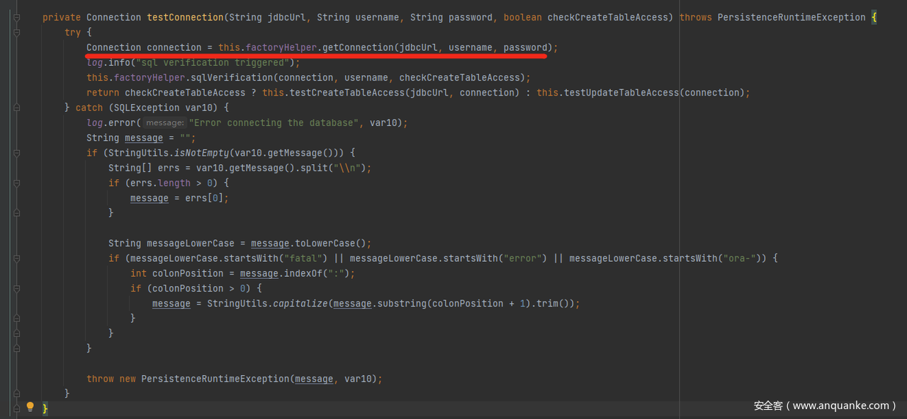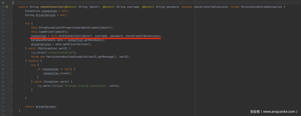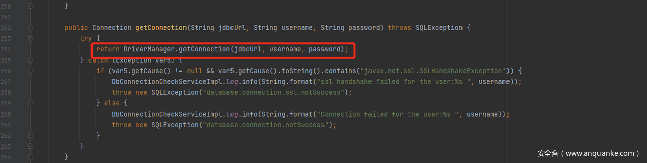 获取到jdbcUrl、dbUsername、encryptedPwd(加密后dbPassword)后调用dbConnectionCheckService.checkConnection