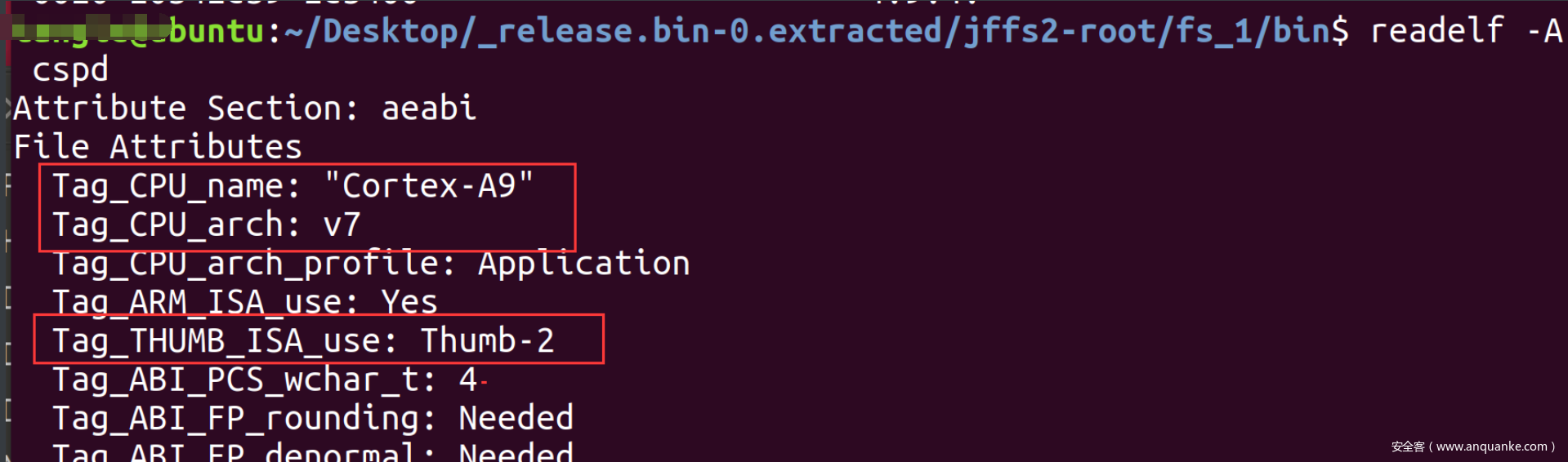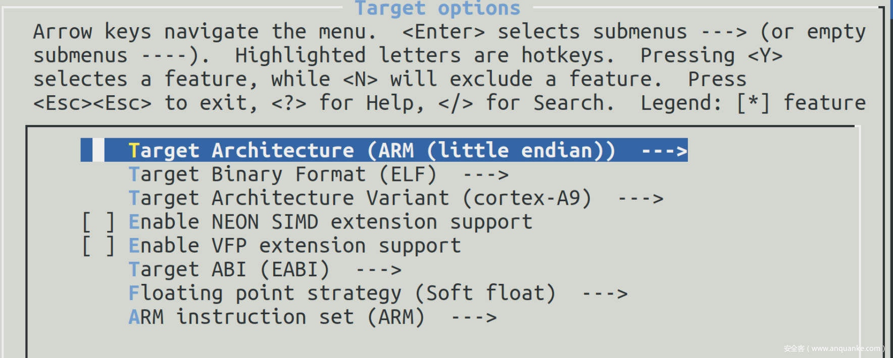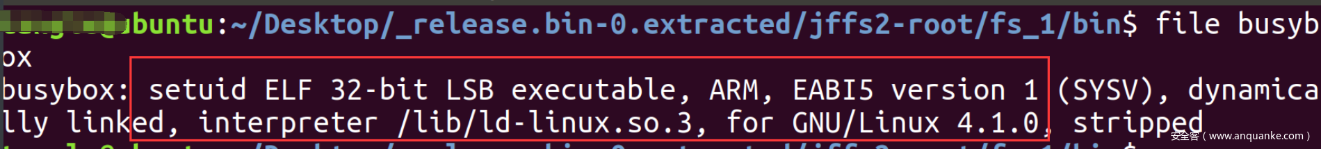 配置界面选项主要根据下图固件中文件的信息,ARM 、ELF32、LSB、EABI5 等配置,ld-linux.so.3说明用的是glibc库 。