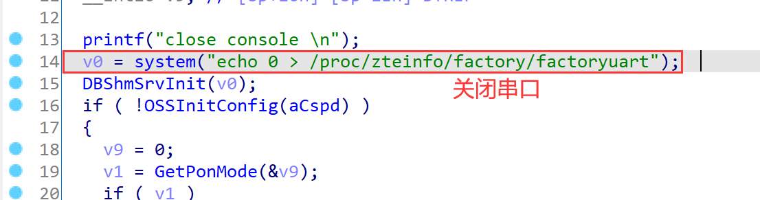 前面了解到路由器正常启动时,串口日志最后打印了close console,可见根文件系统启动后直接关闭了console,导致不能通过串口登录到linux shell。解包设备固件,在程序中搜索close console字符串,发现该字符串出现在/bin/cspd程序中。