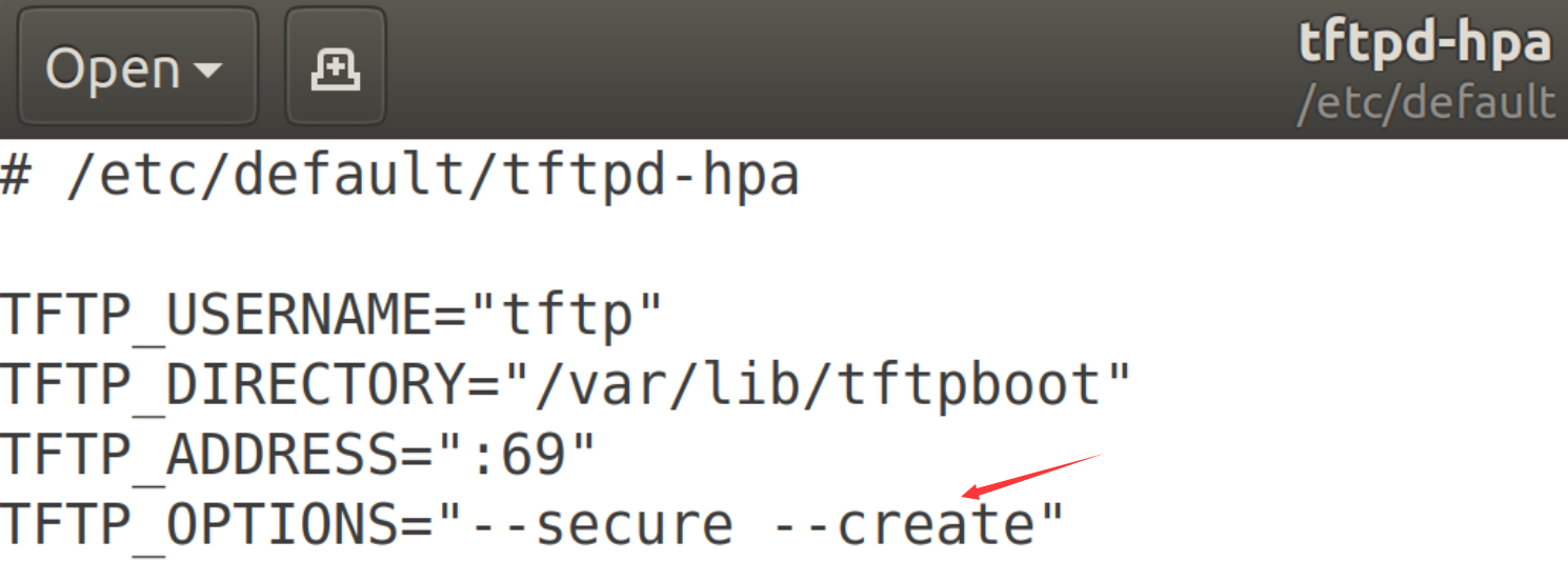 给TFTP_OPTIONS选项添加—create选项,否则无法创建新文件或将新文件上传到 TFTP 服务器。