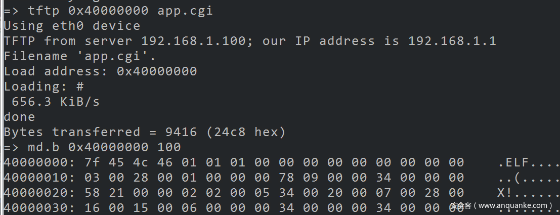 pc与路由器通过网线连接,从tftp服务器成功下载测试文件app.cgi到uboot,至此tftp通信环境已建立,下面修改文件系统上传到uboot。