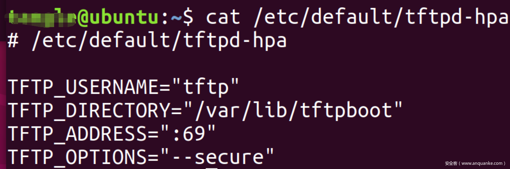 tftpd-hpa服务器的默认配置文件是/etc/default/tftpd-hpa。TFTP_DIRECTORY是TFTP服务器访问目录。
