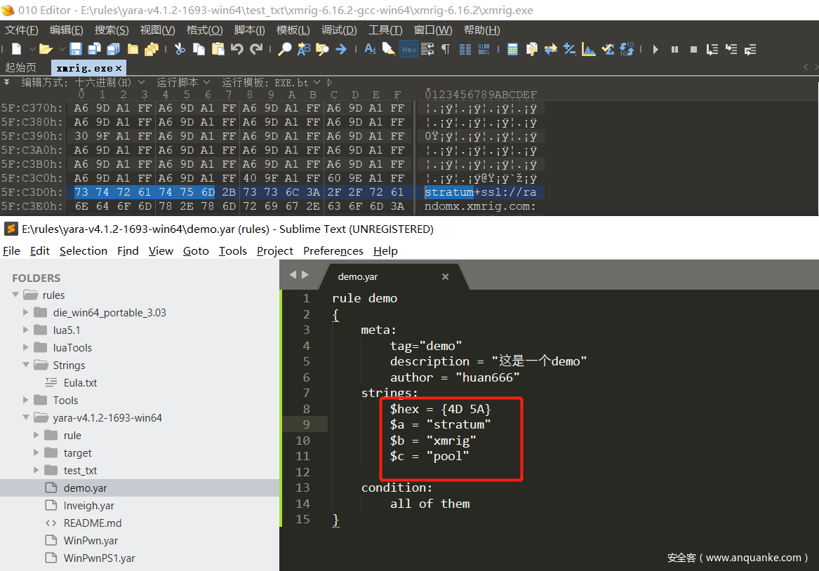 2.编写xmrig挖矿程序检测规则,利用010 Editor、die等PE文件编辑工具进行特征的提取。此规则使用PE文件的文件头4D 5A、挖矿程序专用协议stratum、xmrig挖矿的程序的名称、矿池域名xx.pool.xx等特征进行关联匹配。