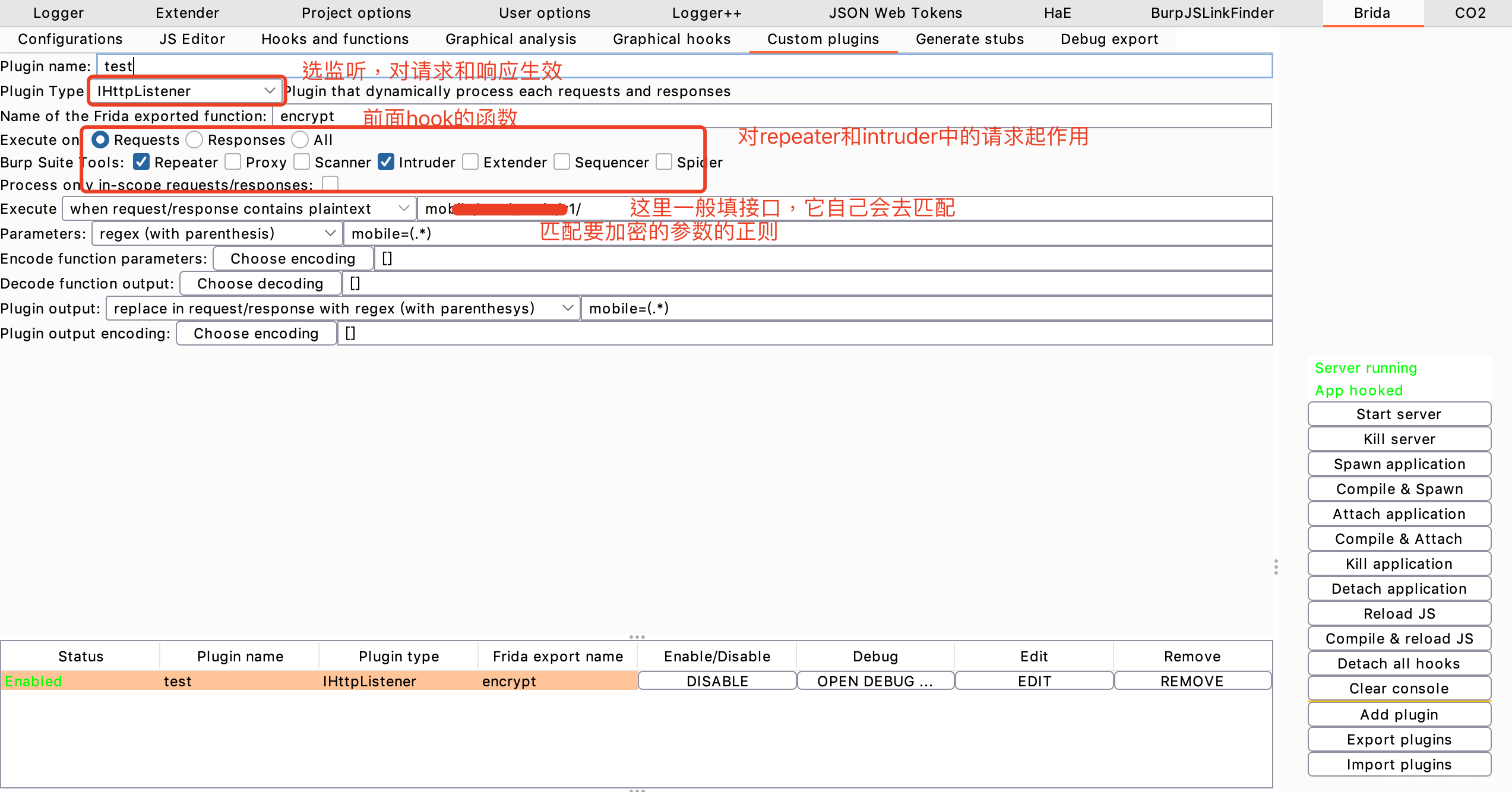 把他放到repeater中,修改对应的加密参数为明文。然后发送。打开brida插件的调试界面。
