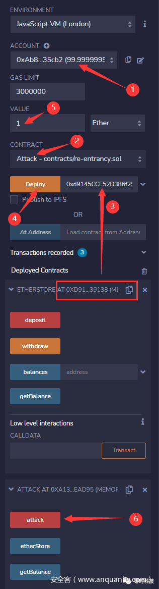 接着,我们换账号部署第二份合约。部署时,需要传入第一份合约的地址。然后将 1 Ether 存入该合约,进行攻击: