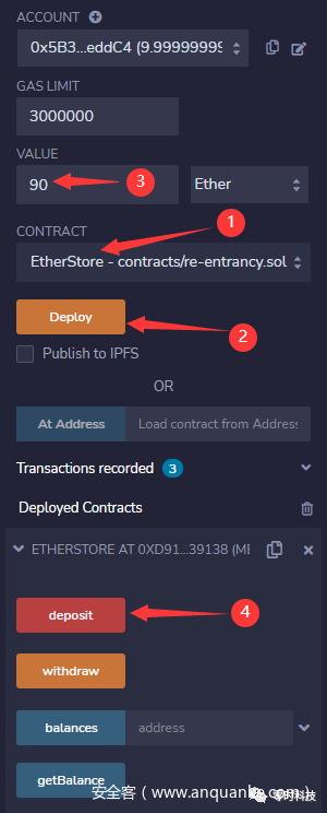 我们部署第一份合约,将 90 个 Ether 存入合约地址: