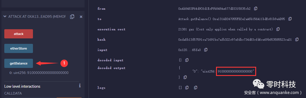 点击 getBalance,查询到该合约有 91000000000000000000 wei,刚好是原始合约的 90 ether 加上我们存入的 1 ether,攻击至此完成。