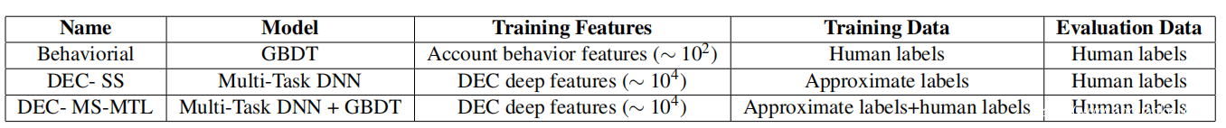 使用三种不同的模型来单独评估DEC 方法(单阶段和使用 MS-MTL)的性能,并与传统技术进行比较。请注意,DEC 的目标是识别犯有广泛滥用类型的帐户。这种方法超越了主要专注于检测虚假账户的传统 Sybil 防御技术。这些模型、它们的训练数据和它们的评估数据的总结可以在下表中找到。比较的三个模型是: