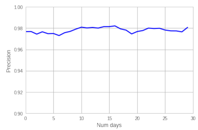 随时间变化的精度:上图检查了在 Facebook 生产中使用 MS-MTL 系统的 DEC 精度的 3 天移动平均值。与之前的评估一样,依靠人工标记随机样本的账户来获得测量的基本事实,这些账户被 DEC 归类为滥用。发现系统的精度是稳定的,精度从不低于0.97,经常高于0.98。