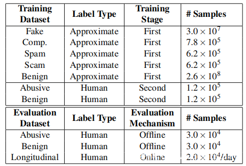 第二个标签源由旨在检测滥用帐户以及用户报告的滥用帐户的自动(非 DEC)算法组成。这些算法可能专注于特定的攻击或滥用类型,或者可能是以前版本的全局滥用检测模型。研究者认为由这些算法识别的帐户大致被标记为滥用帐户。然后,根据每个帐户的滥用类型将标签分成不同的任务。为了获得近似标记的非滥用账户,随机抽取从未被操作过的账户。近似标签的精度低于人工审查的数据,但获取成本要低得多,并且可以大量获取。例如,在评估中,训练数据集有超过 3000 万个近似标签,只有 240,000 个人工标签(下表)。