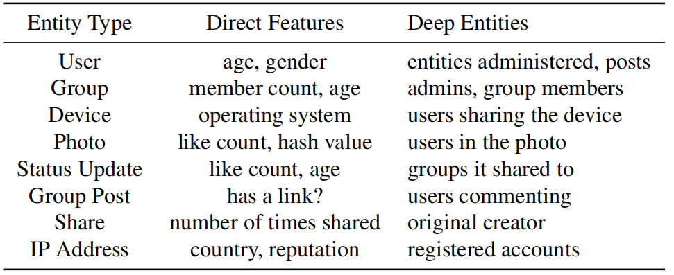 上表列出了 DEC 考虑的一些实体类型,包括用户、群组、设备、照片、状态更新和群组帖子。对于每种实体类型,列出了一些直接特征和深度实体的示例。对于直接特征,使用其他 ML 分类器有效利用的特征,以及在手动调查中发现有用的特征。