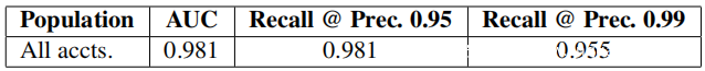 DEC 所有帐户:迄今为止,对 DEC 的评估主要集中在最难分类的滥用类型上——其他生产滥用检测系统未识别出的帐户。另一个问题是 DEC 在识别所有滥用帐户方面的有效性如何,包括那些被其他系统捕获的帐户。为了回答这个问题,评估了从 Facebook 上所有账户中随机抽取的 1.6×10^4 个活跃账户的 DEC,包括那些被其他系统检测为滥用的账户。这些帐户由专业的人工标注员明确标记,并用作评估的基本事实。上表显示了 DEC 在所有账户中的表现。 DEC 在该人群中表现良好,AUC 为 0.981,召回率为 0.981 的精度为 0.95,召回率为 0.955 的精度为 0.99。正如预期的那样,固定精度下的 AUC 和召回率均显着高于其他系统未检测到的帐户子群体。