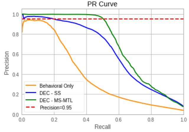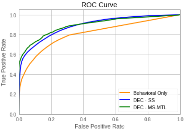 下图检查了所有三个模型的 ROC 性能。 ROC 曲线捕捉分类器中误报和漏报之间的权衡。对于曲线上的所有操作点,DEC 模型(MS-MTL 和 SS)的性能明显优于仅行为方法 – 高达 20%,具体取决于操作点。从 ROC 的角度来看,两个 DEC 模型的表现相似。