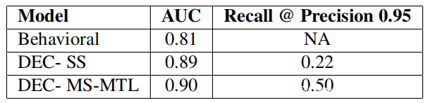 下表显示了三个模型之间的精度、召回率和 ROC 性能的比较。 ROC 性能计算为曲线下的总面积 (AUC)。精度固定为 0.95,这是评估性能的常用操作点。行为模型在任何召回时都无法达到 0.95 的精度,因此被排除在外。发现虽然 DEC 单阶段和 MS-MTL 具有相似的 AUC 性能,但添加 MS-MTL 会使模型召回率增加一倍以上,从 22% 增加到 50%。这种提高的性能,无论是在行为上还是在没有 MS-MTL 的 DEC 上,都可以在生产中部署时显着提高对现实世界的影响。