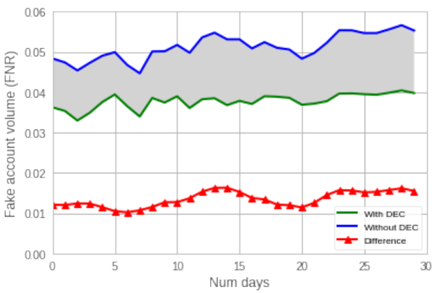 上图绘制了一个月期间观察到的滥用帐户(部署了 DEC)的流行率和没有 DEC 的推断流行率。与非 DEC 方法相比,DEC 召回的损失(相当于 DEC 的 FNR 增加)将表现为总体滥用帐户流行率的增加,或 DEC 的能力下降(差异的减少)两项措施之间。在为期一个月的实验中没有观察到这两种现象,这表明 DEC 的回忆在此期间没有发生有意义的变化,并表明对 DEC 没有对抗性适应。