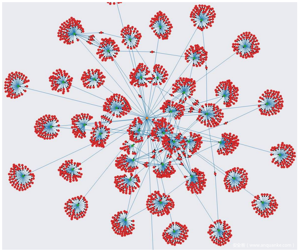 上图展示了一个示例深度特征。此特征基于示例帐户的两跳内的相邻节点(中心,橙色)。两个节点之间的边表示共同朋友的关系。与直接特征相比,这个 2 跳深度特征具有成倍增加的相关值构成特征。