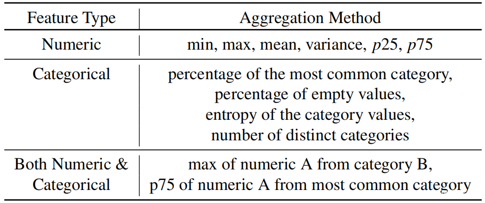 为了定义深层特征,研究者在节点的直接特征集上应用聚合技术,有效地利用跨账户集群的聚合特征来识别虚假账户。如上表所示,对数值特征和分类特征使用不同的聚合方法。为了聚合诸如年龄之类的数字特征,计算了它们分布的统计数据,例如平均值和百分位数。另一方面,对于诸如国籍之类的分类特征,策略是将它们统计地聚合成数字特征。最后还通过观察给定分类特征的数字特征的分布,将数字特征与分类特征联合聚合。例如,如果设备使用 Android 操作系统,则特征可以是从与目标帐户相同的设备登录的帐户数量。