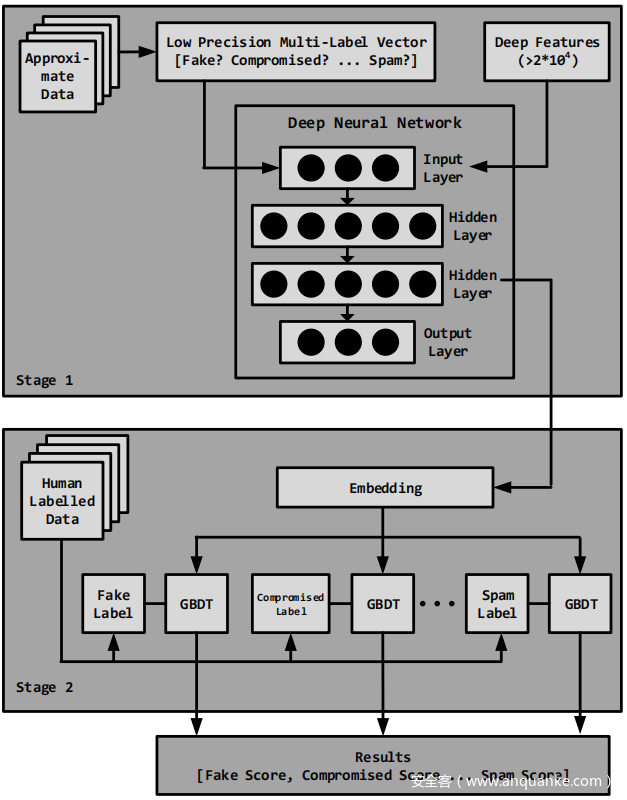 模型训练发生在两个不同的阶段。第一阶段使用大量低精度近似标签在收集的特征上训练多任务深度神经网络 。由于由这些较低精度信号识别的帐户表现出多种不同的滥用类型(例如垃圾邮件、令人反感的内容或恶意软件),为每种滥用类型制定了一个学习“任务”。然后将神经网络的倒数第二层提取为低维特征向量。该向量被输入到模型的第二阶段,该模型使用每个任务的高精度人工标记数据和标准二元分类器进行训练。