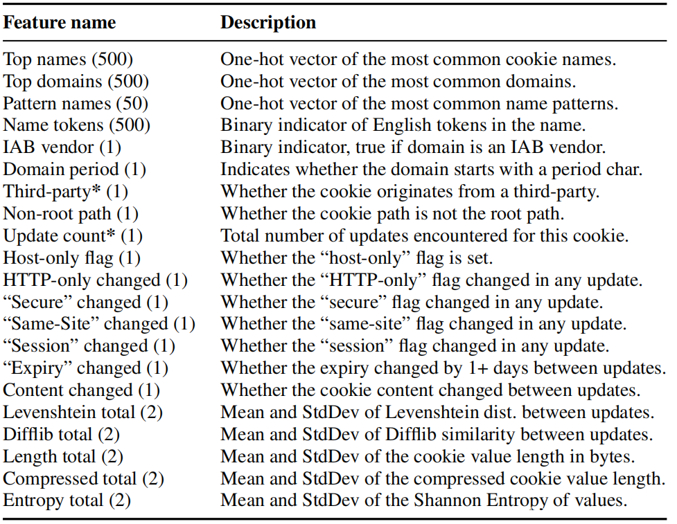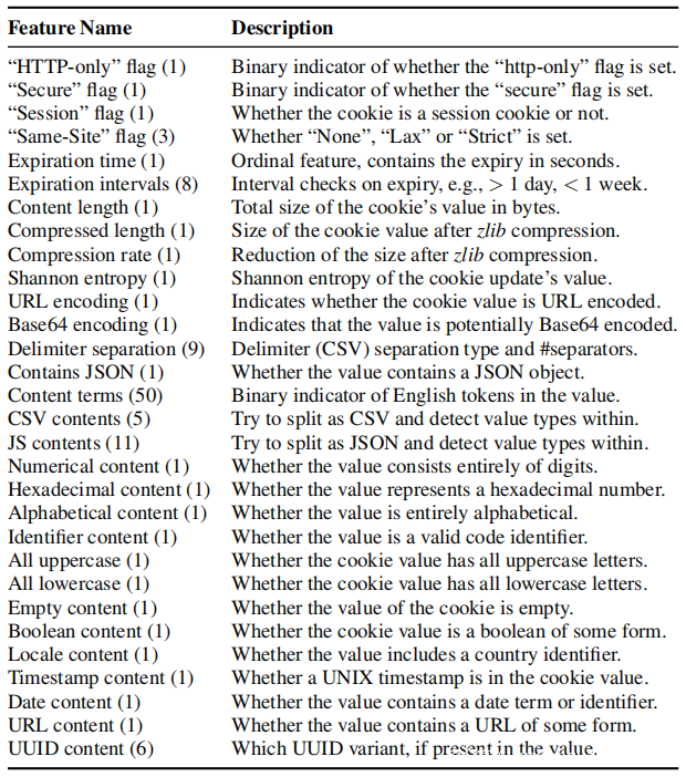每个cookie的特征概述如下图,所有的特征都从每个独特cookie提取。当标记为*的条目在浏览器扩展的上下文中使用时,可能会导致问题。在名称后面的圆括号中,显示了该特征所接受的向量条目的数量。