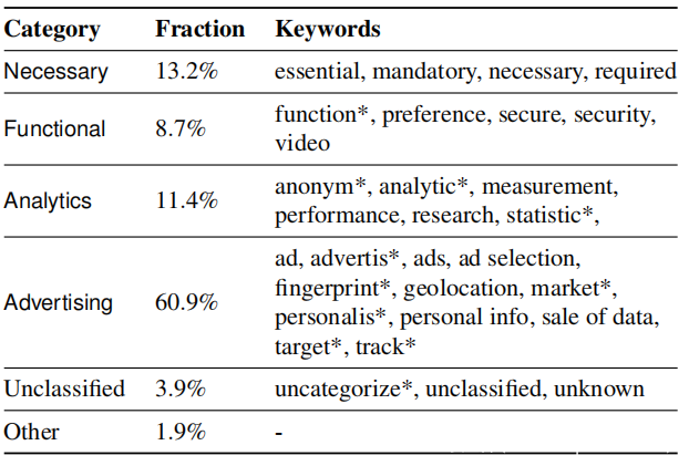 鉴于这些类别不受监管,这种选择因 CMP 而异。例如,IABEurope 定义的行业标准 Transparency and Consent Framework 2.0 (TCF) 提出了一组 12 种 cookie 用途。其他的,比如 OneTrust,甚至支持网站管理员自定义类别的定义。在这项工作中将自己限制在以下四个类别,这些类别最初由英国国际商会定义: