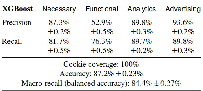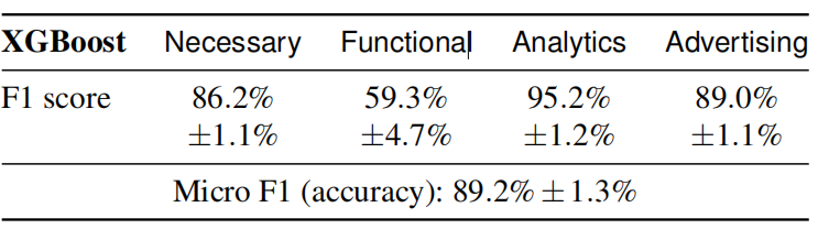 在本节中尝试在数据集上估计理论上最好的分类器性能。收集的 cookie 标签很嘈杂,因为不同的网站可以使用相同的第三方 cookie,但它们不一定同意其目的。这意味着不可能在此数据集上达到 100% 的准确度,因为尽管目的不同,某些 cookie 将无法区分。为了估计这种情况下数据集中 cookie 的百分比,收集每个第三方 cookie 名称和域的多数类,并计算具有偏差类的 cookie 的百分比。这提供了 7.2% 的标签下限,即第三方 cookie 中的噪声标签。如果假设第一方和第三方 cookie 的噪声相似,可以得出结论即总体准确度上限约为 92-93%。 总体平均准确率为 87.2%,分类器在该数据集上接近最佳性能。XGBoost应用于使用Cookiepedia标记的cookie数据集时的性能如下: