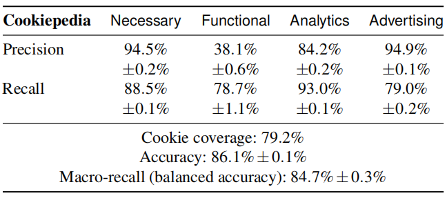 将模型的性能与该领域专家的手动分类性能进行比较。即从公共 cookie 存储库 Cookiepedia 中查询 cookie 用途。据报道,Cookiepedia 存储了超过 3000 万个 cookie 的数据,其中很大一部分都标有目的类别。这些类别与前文中选择的类别相匹配。对于数据集,Cookiepedia 为 79.2% 的 cookie 提供了用途。为了使用 Cookiepedia 作为分类器,在数据集中查询每个 cookie 名称,并从存储库中获取相应的目的。然后将这些目的与从 CMP 收集的类别标签进行比较。为了验证 Cookiepedia 作为分类器,将 cookie 数据集分成 5 个大小相等的块,并计算平均准确率、精度和召回率。在下表中展示了结果。