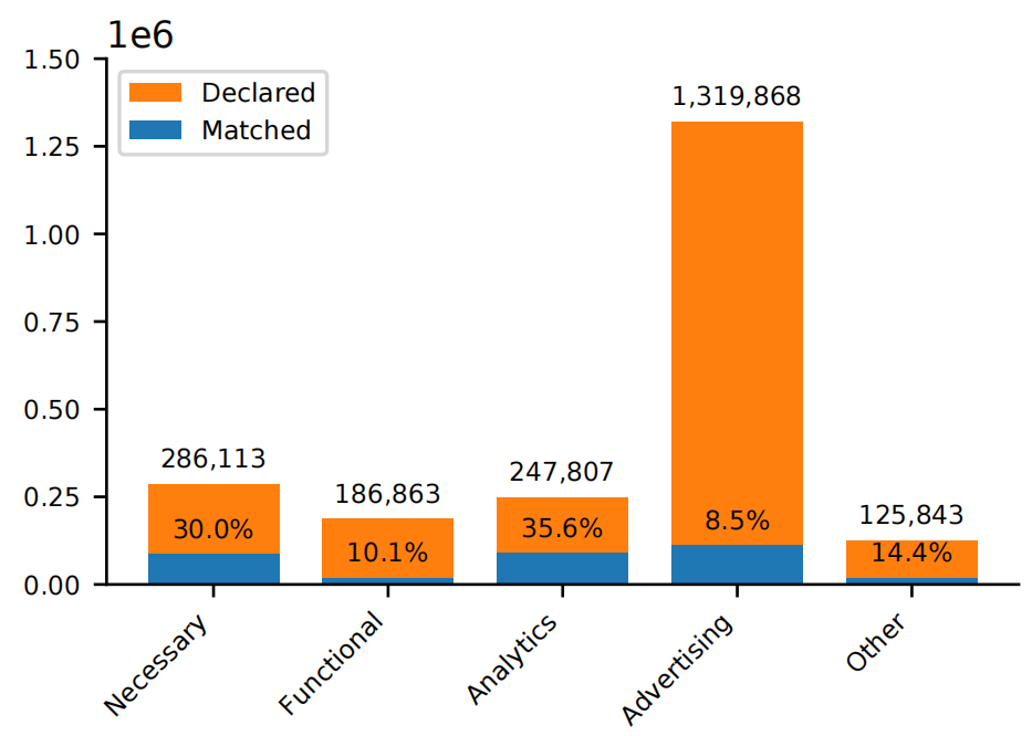 上图显示了每个类别的声明总数,以及观察到的 cookie 的比率。重要的是要注意功能性 cookie 的类别代表性不足,在训练分类器时通过加权样本来弥补这一点。此外,尽管声明过多,但在 602k 观察到的 cookie 中,只有 53.6% 可以与声明匹配。这意味着网站上可能存在许多 cookie 弹窗未知的 cookie。