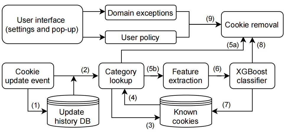 之后,CookieBlock 检查其存储以确定最近是否遇到过 cookie 或是否已为其分配了预定义的类别 (3)。在这种情况下,它检索现有的目的标签 (4),并直接跳到策略执行步骤 (5a)。如果 cookie 没有存储现有的标签,那么继续进行特征提取 (5b)。这将 cookie 对象转换为稀疏向量表示 (6)。然后它在这个向量输入上运行预先计算的 XGBoost 模型,预测 cookie 的目的标签。然后,预测的标签会在扩展存储中缓存一小段时间 (7)。最后,预测的标签被传递到策略执行程序 (8),它决定是保留还是删除 cookie。