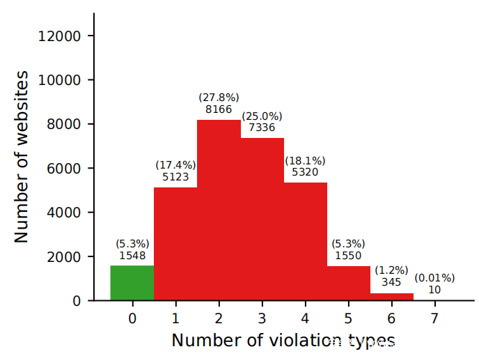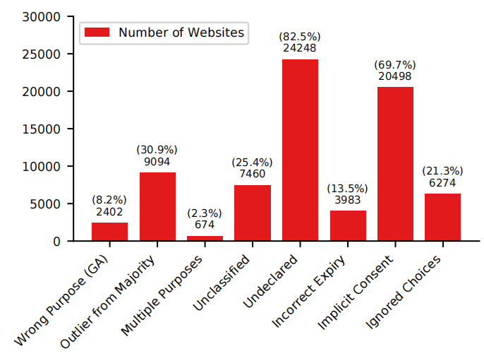 此外,分析了网站是否假定隐式 cookie 同意或尊重用户的同意选择。通过观察浏览器中设置了哪些类型的 cookie 来实现这一点。总之,在 29 398 个网站中,94.7% 的网站至少包含一个问题,而 77.3% 的网站至少包含两个问题。