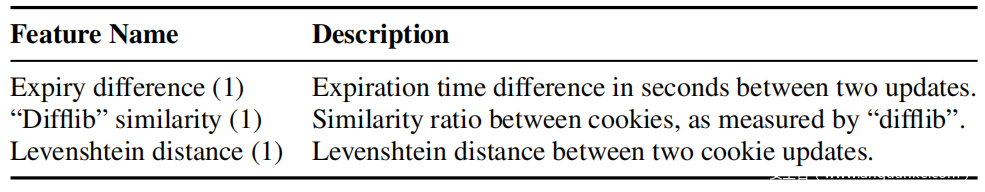 更新特征:Cookie 是动态的,可以通过 HTTP 请求或 JavaScript 代码中的事件频繁更新。因此不仅会考虑 cookie 的单一状态的特征,还会考虑随时间发生的变化。例如,cookie 在固定时间间隔内更新的总次数,或 cookie 更新之间的编辑距离。