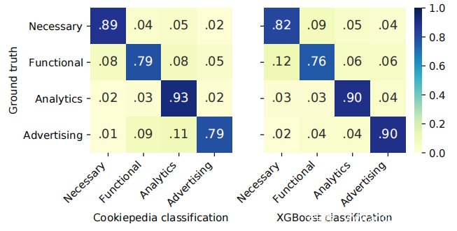 总而言之,当查询每个 cookie 名称时,Cookiepedia 在数据集上实现了 84.7% 的平衡准确率。自动化、XGBoost 训练的分类器实现了 84.4% 的平衡准确率,从而获得了与人类专家所达到的性能相当的性能。虽然 Cookiepedia 在必要类别中更准确,但 XGBoost 在广告 cookie 方面表现更好。在必要 cookie 方面的不足可以通过使用另一种贝叶斯成本函数来抵消,该函数比其他方法更强烈地惩罚必要 cookie 的错误分类。最后,Cookiepedia 可以分类的 cookie 数量是有限的。对于数据集,Cookiepedia 能够为 79.2% 的 cookie 提供一个类别,而分类器可以为每个 cookie 预测一个类别。