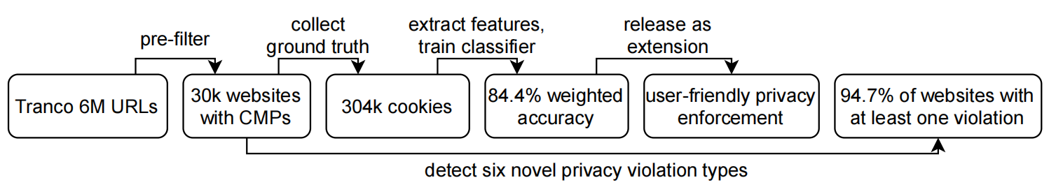 首先,本工作识别了cookie 弹窗中的不准确信息,并将其应用于大约 3 万个网站的样本,发现其中 94.7% 的网站可能违反 GDPR。其次,提出了一个机器学习分类器,它可以从 cookie 中推断出目的,达到与人类专家相媲美的性能。第三,开发了一个浏览器扩展程序,可以根据用户的偏好自动删除 cookie,与同类方法不同,该扩展程序适用于任何 cookie,并且不需要网站合作。最后发布了工具,允许网站管理员验证和改进其网站的 cookie 同意合规性。