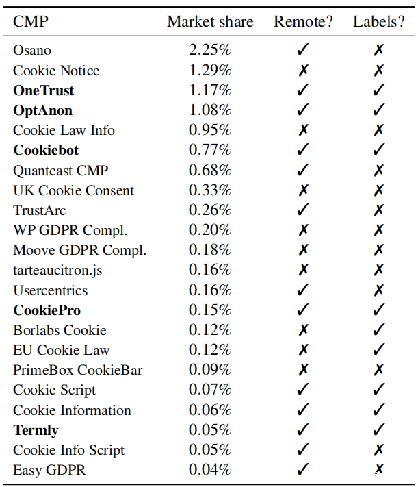 GDPR 提出了对同意解决方案的需求,由此出现了一个新的“同意即服务”(consent as a service)行业。提供这些服务的公司,称为同意管理平台 (CMP,Consent Management Platform),为网站提供 cookie 弹窗,用于处理收集用户的同意,并详细描述 cookie 的所有用途。与仅告知用户仅使用 cookie 的简单 cookie 通知不同,CMP 承诺为用户提供对其个人数据的更多控制权,从而满足 GDPR 在这方面的要求。然而在来自英国的大约 14k 个网站和来自希腊的 3k 个网站的样本中,分别只有 44% 和 48% 的网站向用户显示 cookie 弹窗。 90% 的网站使用跟踪 cookie,这意味着许多网站忽略了遵守 GDPR。