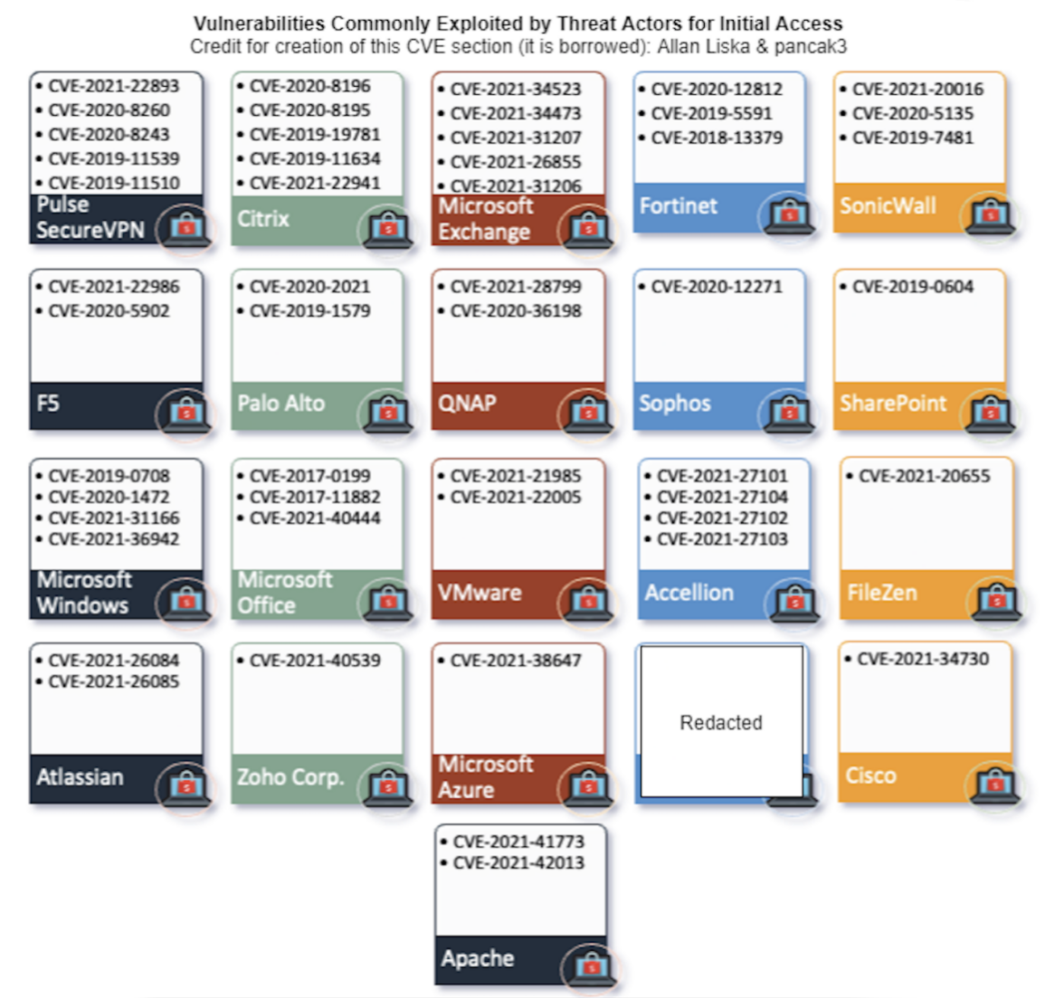 1.以目标漏洞为途径:攻击者通过黑客搜索引擎来获取受害者对外暴露的资产,之后进行ip探测,域名探测,端口开放探测(如RDP端口)以及漏洞扫描,类似于红蓝对抗中攻击队前期对目标的资产梳理和信息搜集,期间会用到各类黑客搜索引擎如Shodan、Censys,在确定目标资产后进行漏洞扫描,漏洞扫描过程主要探测是否存在一些知名软件的历史CVE漏洞,相关软件产品如VPN产品SecureVPN、云桌面常用的Citrix软件、虚拟化产品Vmware、微软系列的Exchange、负载均衡设备F5以及路由器设备Cisco等。黑客一旦探测到相应产品存在的漏洞,就发起攻击,攻击成功后可获取目标权限,之后可以进行内网横向,植入后门等操作,最终获取有效的初始访问权限。具体使用到的漏洞如下图所示。