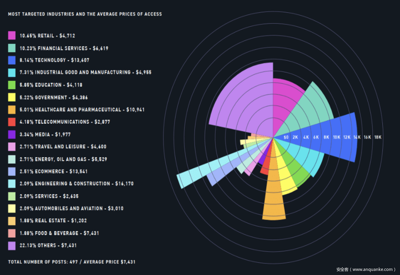 在利益的驱动下,RaaS与IAB的交易越来越密切,值得关注的是:根据Digital Shadows统计,IAB交易的热点行业权限top5 为零售行业、金融行业、科技行业与工业制造业(如医药制造),科技行业的初始访问代理权限平均价格最高为13,607 美元。