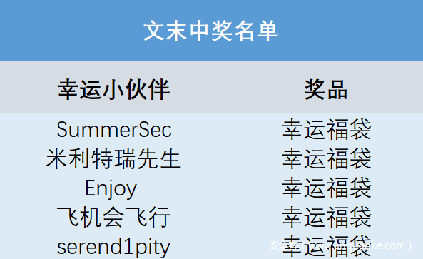 恭喜以上的幸运小伙伴喜提“幸运福袋”一枚!请添加用户交流8群(819797106),在2月16日之前私信@安全客 您的邮递地址~ 格式:【年终关键词小盘点文末中奖+您的官网昵称+邮寄地址+联系方式】。大家注意时间,逾期不候哦。