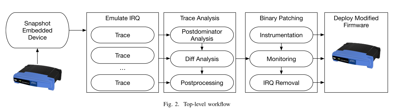 下图所示未系统流程图,首先获取设备运行态的快照,然后将其迁移到全系统模拟器PANDA中,紧接着在PANDA中触发中断、并通过fuzz MMIO寄存器来收集trace;进而为了发现中断处理程序,使用differential slicing分析收集到的trace;然后可以将固件中有关handler的功能替换为无功能函数,使其忽略外设的输入,以此来禁用相关功能。