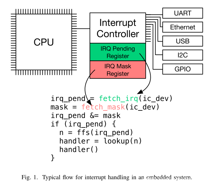 - 外设发起中断,中断控制器将中断号存储在MM寄存器中的bitset中的一个比特,然后再由其向CPU发送中断信号。