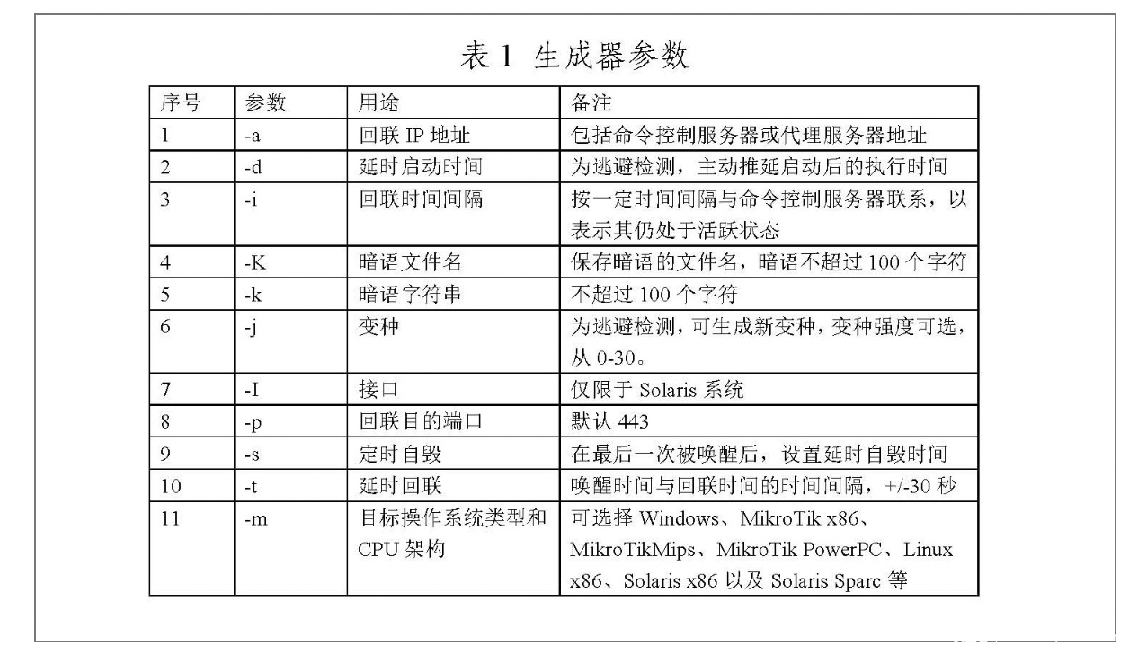 美国中央情报局(CIA)攻击人员首先根据任务需求和目标平台特点,使用生成器(hive-patcher)生成待植入的定制化受控端恶意代码程序(即hived)。在生成受控端程序前,可以根据实际任务需求进行参数配置(如表1所示)。