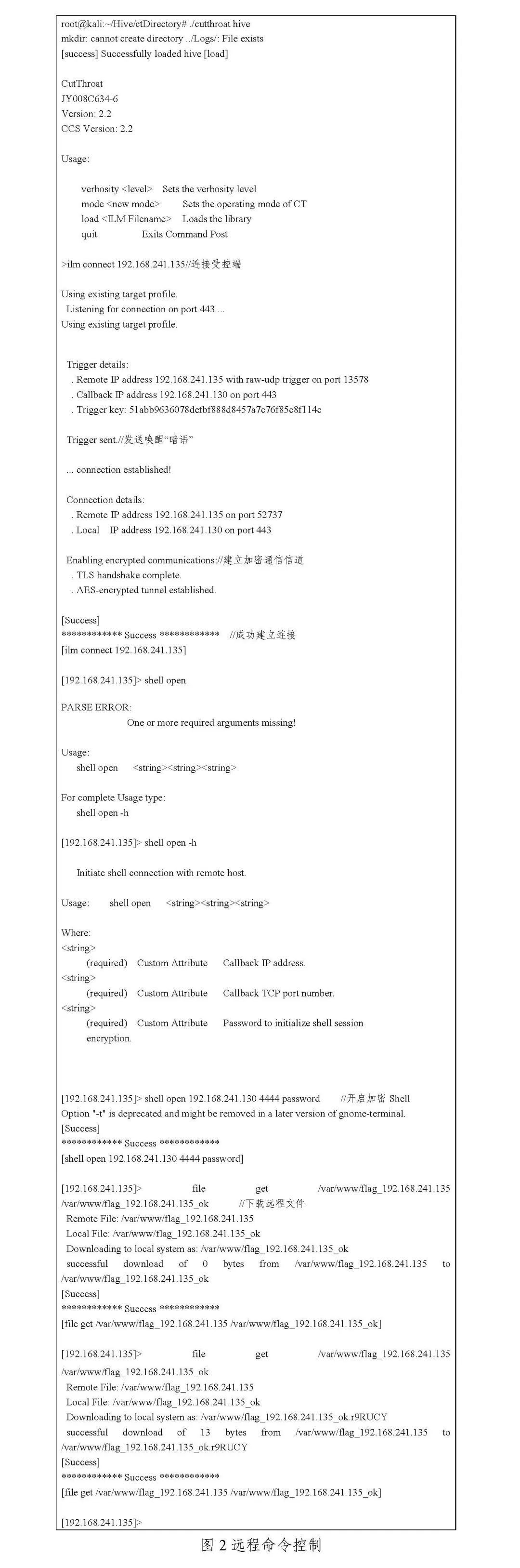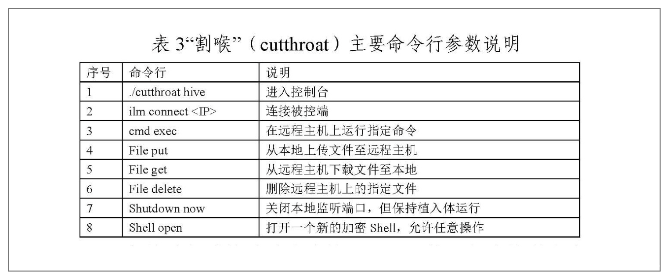 美国中央情报局(CIA)攻击人员利用名为“cutthroat(割喉)”的控制台程序对客户端进行操控。其主要命令参数如表3所示。