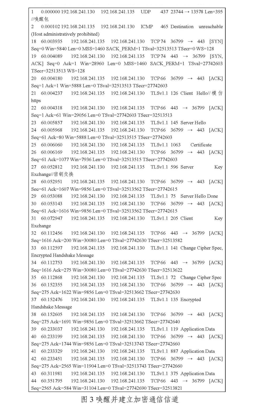 为躲避入侵检测,主控端通过发送“暗语”唤醒受控端恶意代码程序,随后模仿HTTP over TLS建立加密通信信道,以迷惑网络监测人员、规避技术监测手段(如图3所示)。