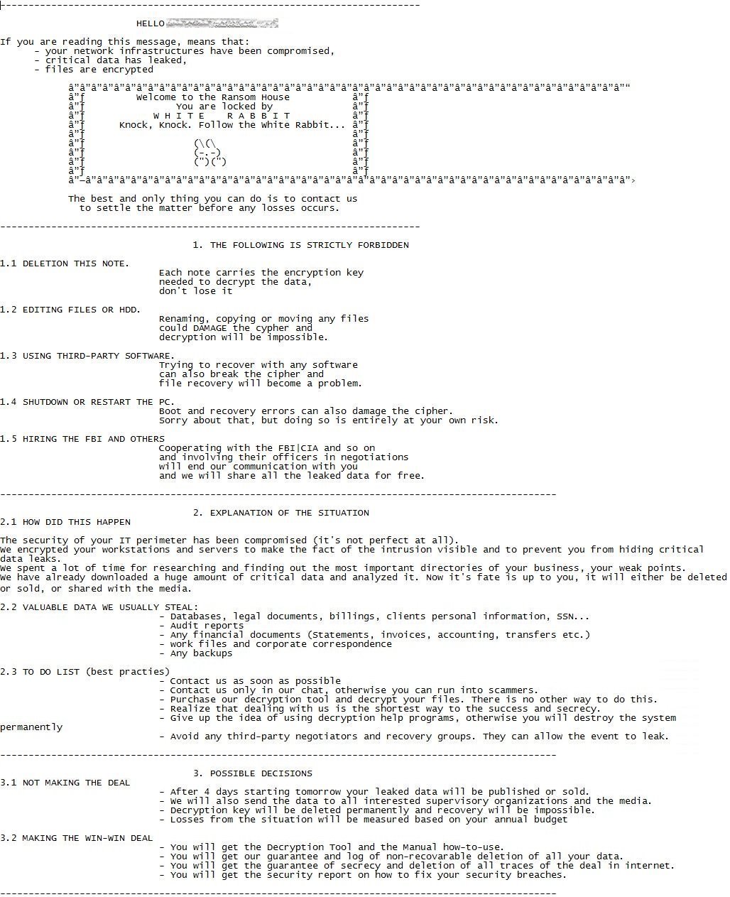 名为“白兔”,实为白切黑。近期,有安全团队捕获一名为White Rabbit的新勒索软件家族,并根据相关溯源信息推测该勒索软件家族疑似为FIN8黑客组织的副业。FIN8是一个以金融组织为主要目标的黑客组织,主要通过部署可以窃取信用卡详细信息的 POS恶意软件实施攻击。此次,首次公开提及White Rabbit勒索软件则是由勒索软件专家Michael Gillespie在推文中寻找到的恶意软件样本。