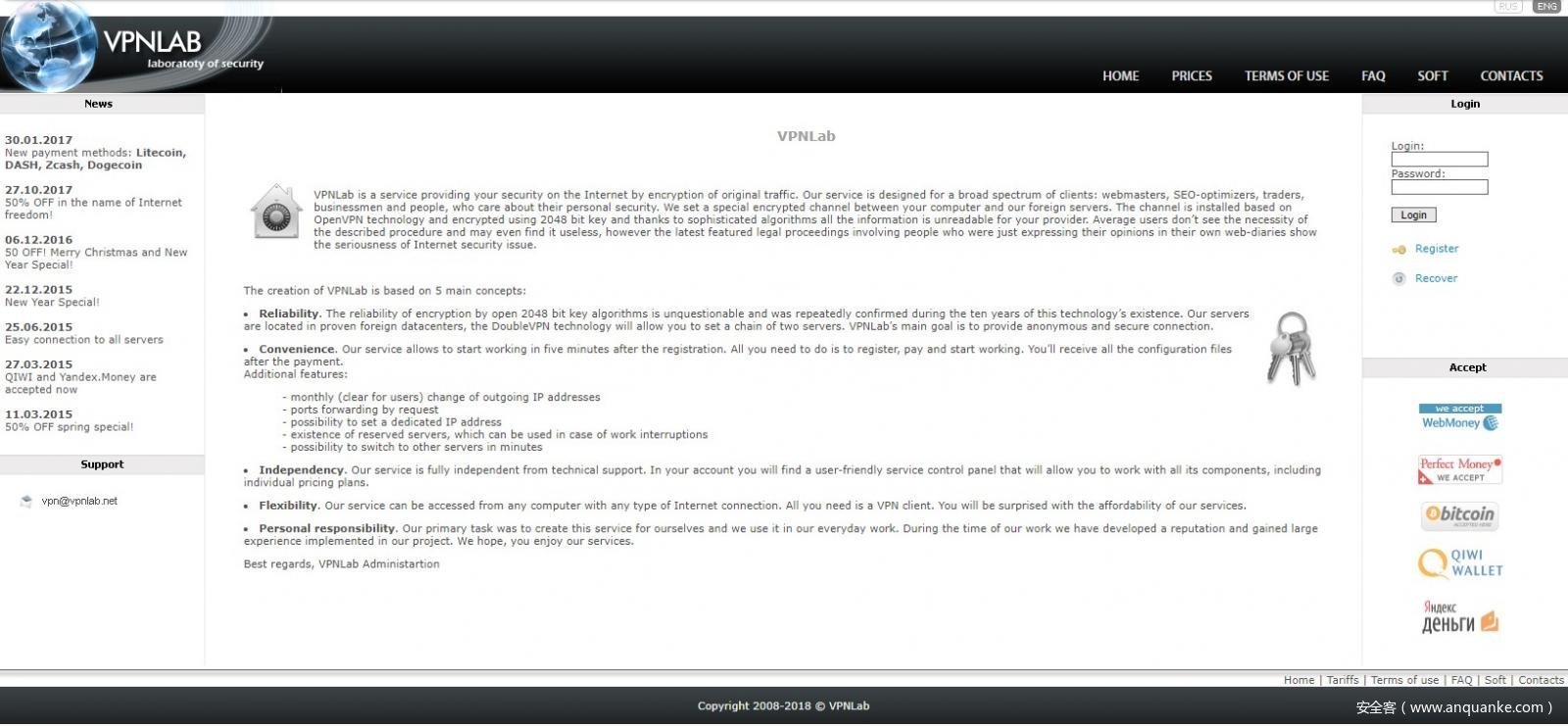通常,网络犯罪分子使用VPN(虚拟专用网络)服务隐藏其真实的位置和身份,并通过多个加密隧道定向网络流量来混淆轨迹。因此,与普通的VPN服务相比,针对非法使用的解决方案需要多层加密和反弹功能。VPNLab.net 就是此类服务中历史最悠久且值得信赖的服务之一,成立于2008年,并以每年60美元的价格提供基于OpenVPN的技术和2048位加密。此次,VPNLab.net的关停可能会在短时间内,一定程度上降低网络犯罪分子的活跃度。[阅读原文]
