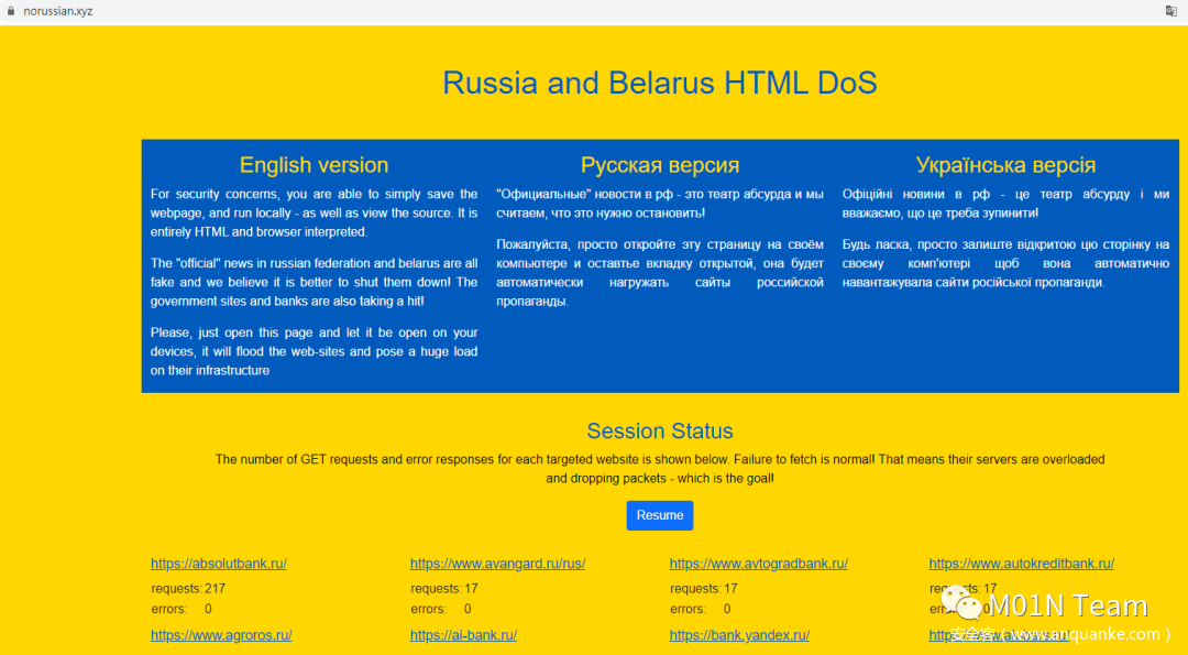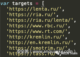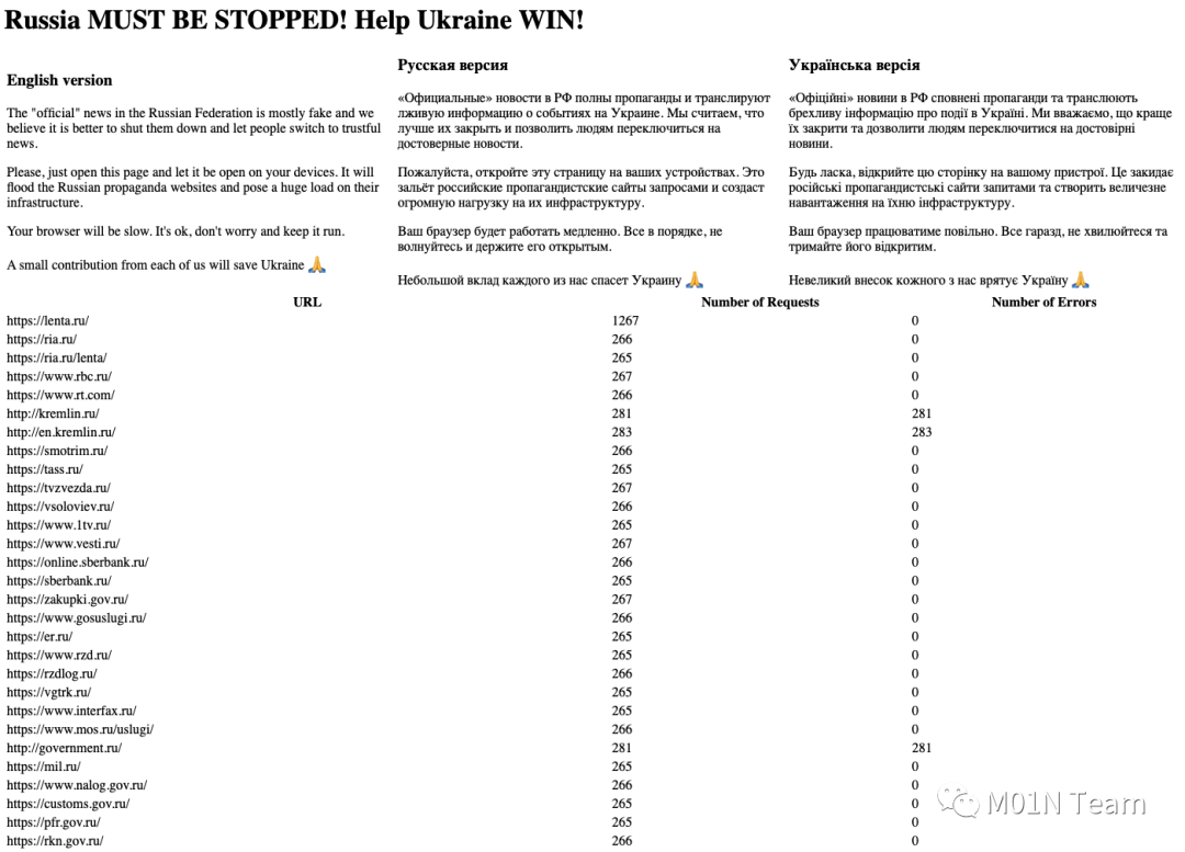stop-russian-desinformation.near.page攻击页面分为两个部分。第一部分为网页的介绍信息,包括英语、乌克兰语和俄语三个版本,主旨大意是希望反对俄罗斯政府的人保持该页面开启;第二部分是俄罗斯宣传网址列表和当前请求的次数以及错误次数。该页面主要通过JS向俄罗斯网址发送请求实现DOS攻击,页面中写入一个静态的地址列表,为66个需要请求的俄罗斯宣传网址。
