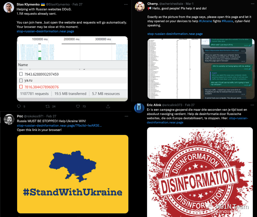 根据威胁情报监测,互联网注册域名为stop-russian-desinformation.near.page的网站作为攻击武器载体,在客户端浏览器进行访问时会向俄罗斯联邦相关网站发起大量攻击请求。攻击组织利用互联网时代信息的快速传播能力,致使网站被大量点击访问,而任何一个访问该网站的个人都被动加入到了此次攻击行动当中。