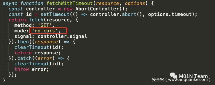 在构造请求时,设置了较长的timeout,使得HTTP请求不能及时释放,消耗目标服务器的连接数,达到DOS攻击的目的。同时使用Get请求并设置‘no-cors’模式,使得浏览器进行跨域请求时不妨问也不保存服务器返回的内容,减小了客户端的压力。