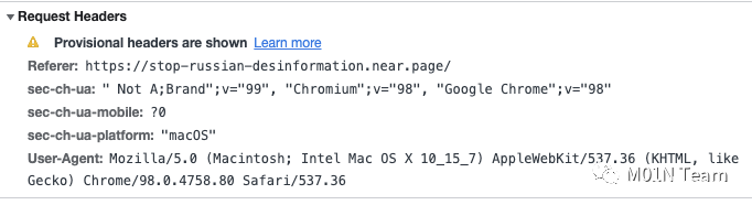 查看某一个请求的请求头信息,其中的Refer信息中包含了本地活动的网站地址:https://stop-russian-desinformation.near.page/。服务端可以通过检查Refer信息区分请求是否是本次攻击所发起的异常请求。